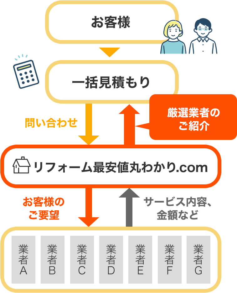 お客様のリフォーム内容を事前にしっかりヒアリングすることで、その内容が一番得意で一番安い業者3社のみを紹介します。