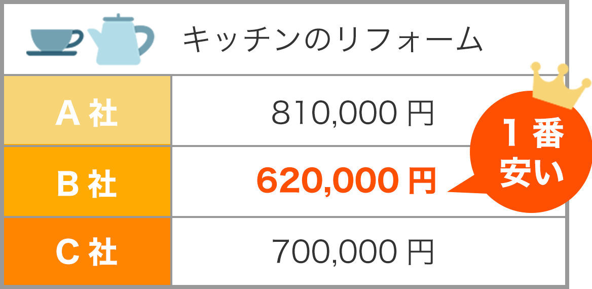 お客様の地域をお伺いし、その地域で対応しているリフォーム会社の中から最も費用の安い3社を厳選します。
