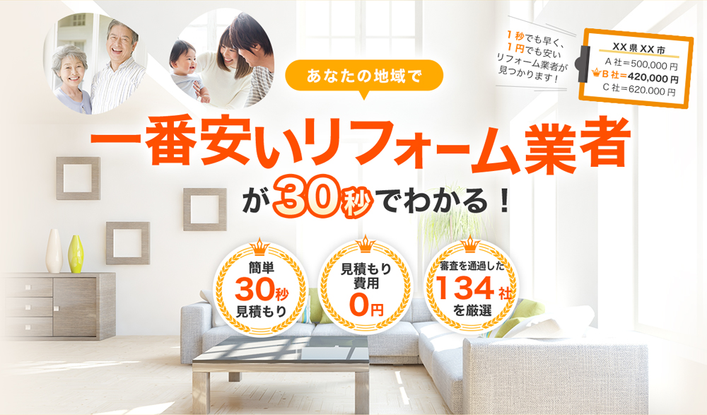 リフォーム最安値丸わかり.comでは、お客様からヒアリングしたリフォーム内容が得意な業者をピックアップし、その中から一番安いリフォーム会社3社を厳選します。